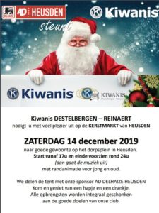 Le Kiwanis de Destelbergen-Reinaert vous invite au marché de Noël à Heusden le 14 décembre.